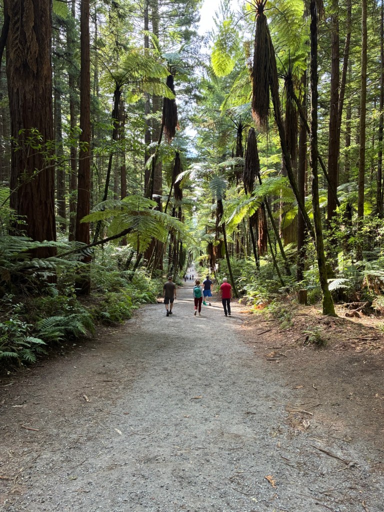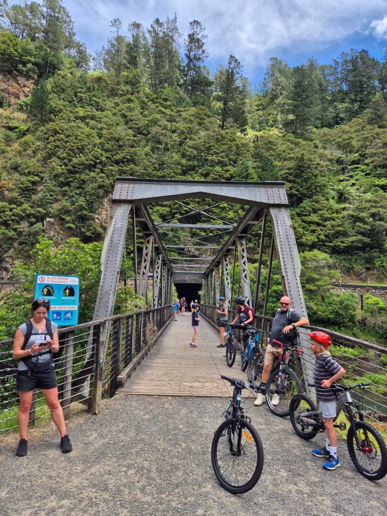 The tanks were 15 metres high and filled with a mix of potassium cyanide solution and crushed ore and were stirred using compressed air which bubbled through the mixture. this was a local invention to maximise gold recovery.The arches remain so the scale and size of this Karangahake tunnel was so dark to cycle through and I dread to think the work involved and lives lost making this former railway tunnel (they must have been very narrow trains) single track. Approx 1km long.We left the gorge and stopped for a walk in The Red Woods which was very relaxed and very beautiful.