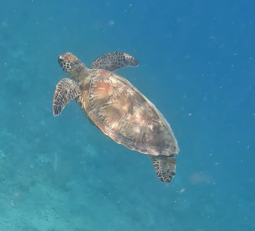 Katie takes us on a small outboard raft to the reef from the boat, no fins/flippers allowed here to ensure the coral is preserved due to its proximity to the surface. I really have taken to snorkelling and the reef here was more alive and beautiful, however, there were a lot less fish. There were some Green turtles out in sea as we travelled out and then one on the reef which some people saw and photographed they are very lovely creatures.