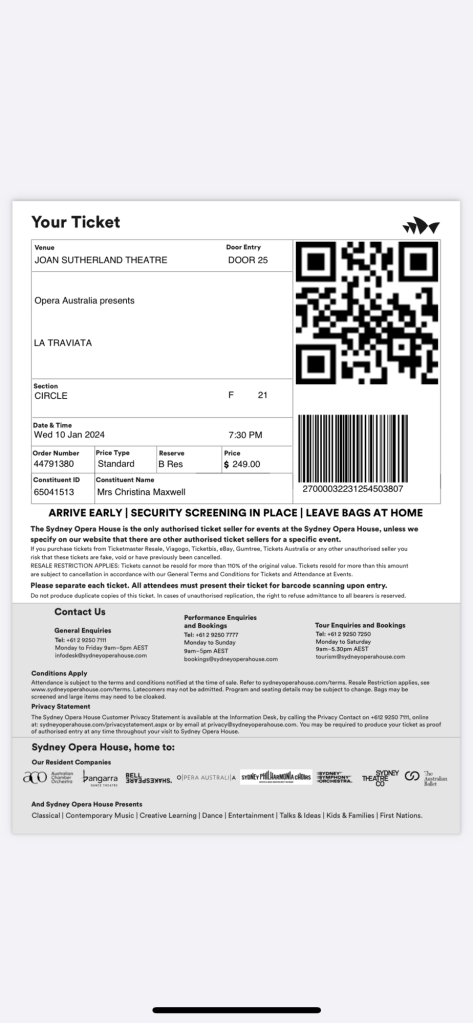 It was impossible to swim due to the numbers in the water, jumping the waves and diving through them was the height of the pleasure and it was fun. We travel back in good time as I have tickets to see La Traviata tonight at the Opera house, a Christmas treat from my lovely children & spouses, unfortunately, Andrea was unable to source a ticket and my concern is getting back after, it turns out one of the girls on the trip Aine, somehow sourced a ticket this morning and so I am delighted to have company later.