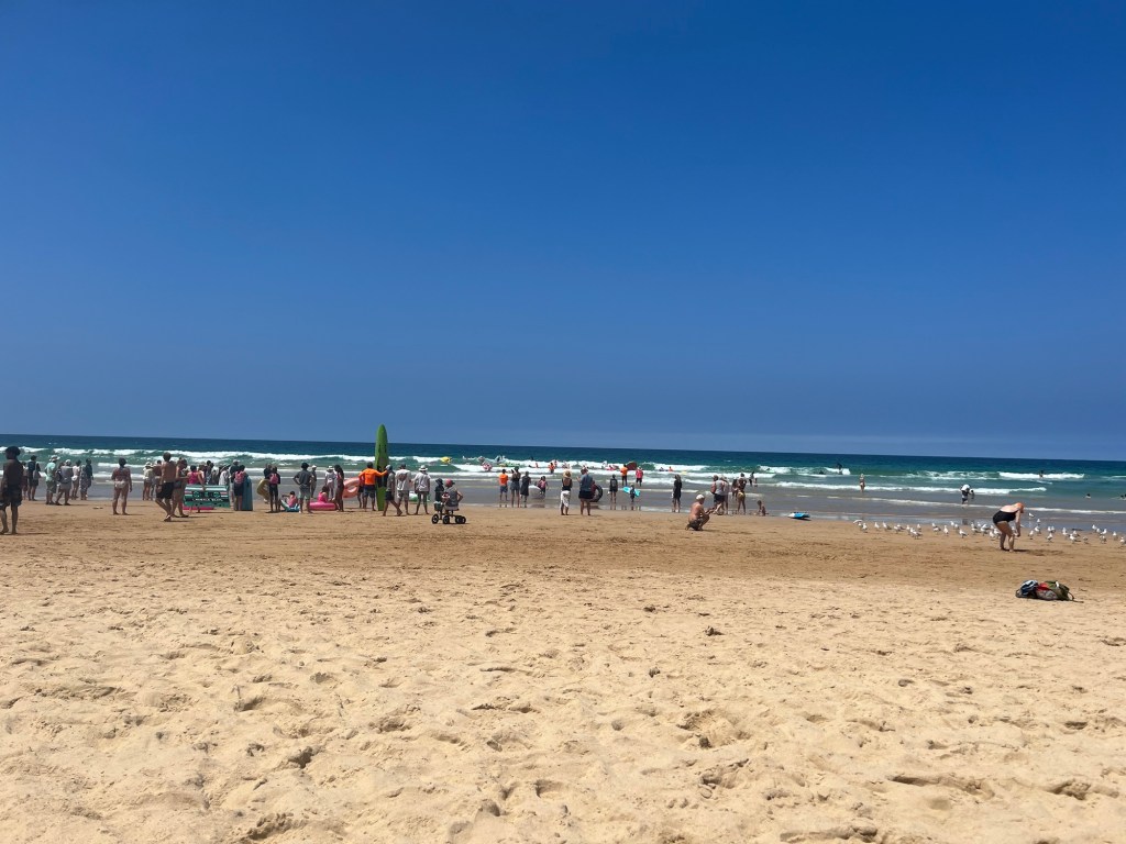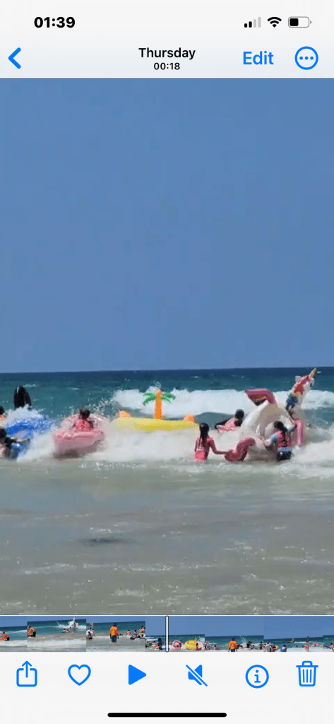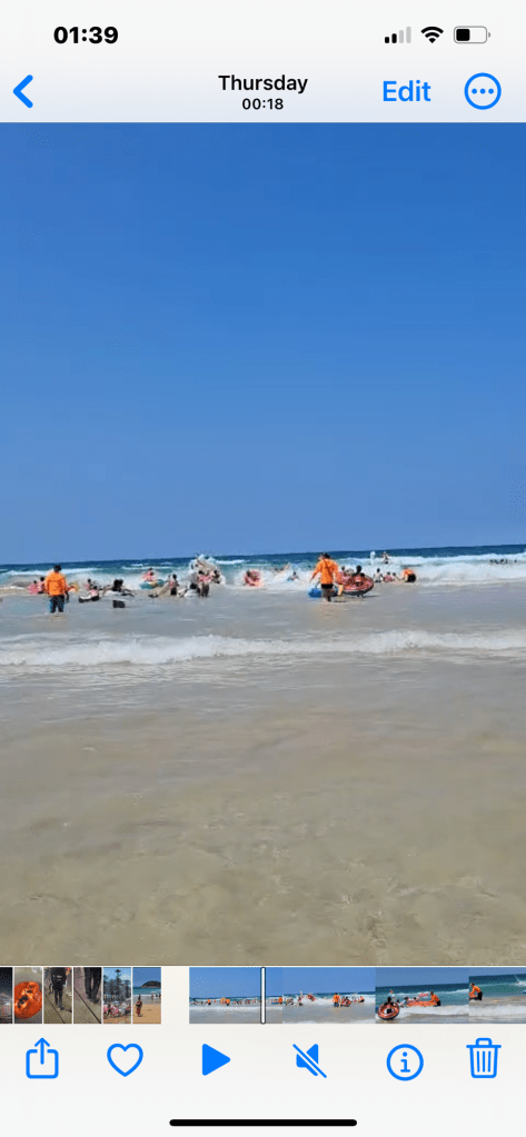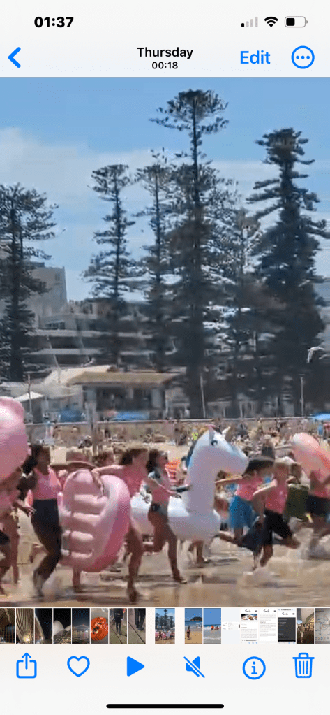 We arrive at Manly and just walk around 5-10 mins over to the beach which is really busy, we hire 2 of the low reclining deck chairs and an umbrella and watch the world go by, again the sardines are between the flags and the life guards are not only warning about the rip’s but the Box Jellyfish! Explaining that if stung it is really painful for around an hour and then uncomfortable for around 24 hours after this, you would think this would be off-putting! It is the children’s summer holidays in Australia and approx 100 children arrive with their inflatables, about 20- 30 guards get in the water next to the flagged area and then it’s ready steady go! What a joyful sight, my heart is in my mouth worrying about what if one drowns or gets stung, what I have forgotten is that this is where these children grow up they are literally water babies, respectful of the water, they are also very well protected both in the water and on the shore by their group leaders and guards.