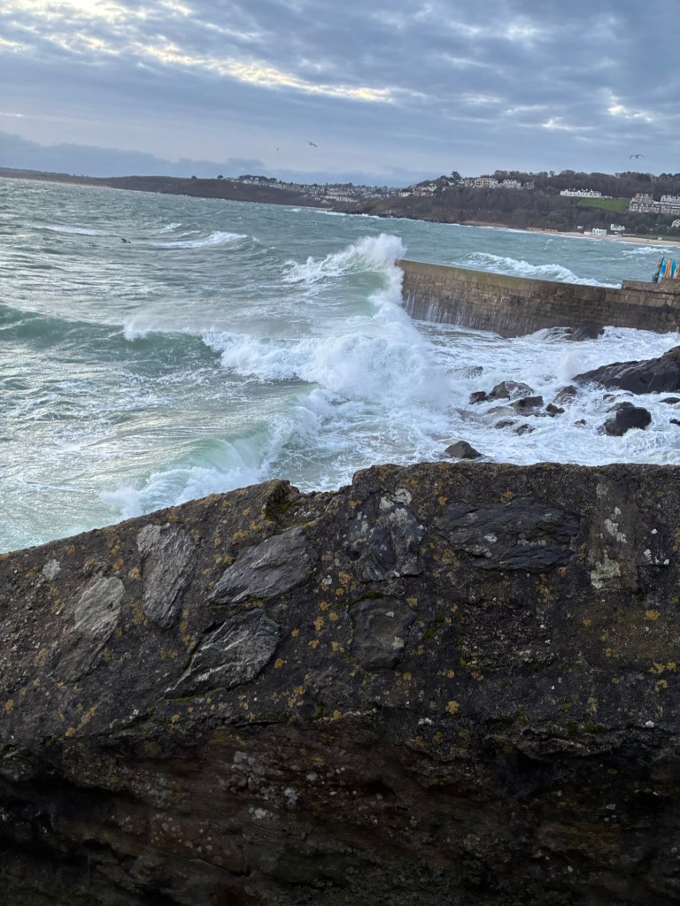 Christmas Eve; storms forecast, they weren’t kidding! I went out for my morning walk with Seamus, it was blowing a gale and the sea was bashing against the rocks and harbour, bracing to as the least. The sea is beautiful and yet so treacherous, St Ives is so old, I think of the people that must have lived there once and how hard their lives must have been.