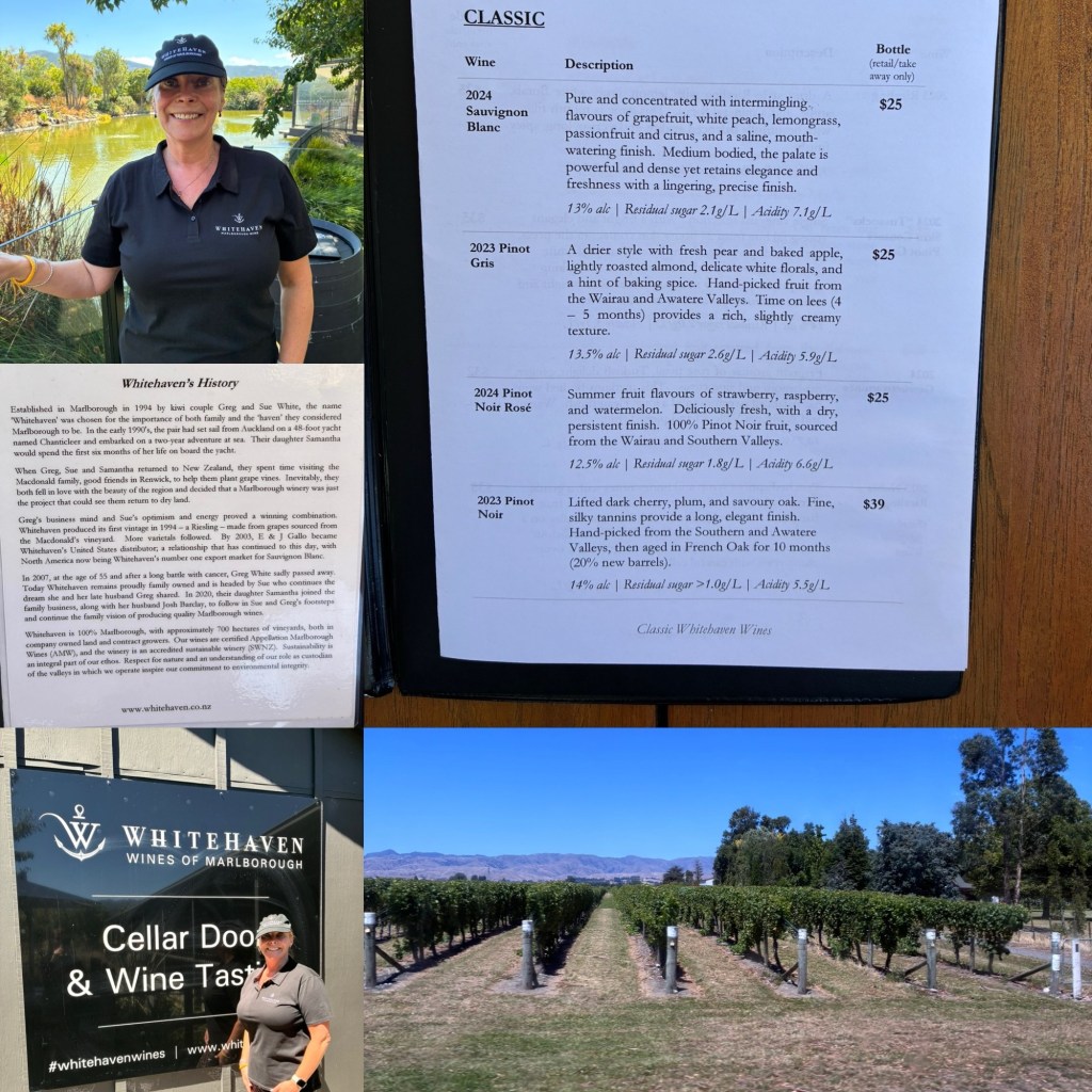 There were 4 choices of wine tasting, Classic, Aromatic & Premium where you get 4 tasters and the 4th, Bubbles where there was one. I chose the Classic, they were very good at changing the first one from Sauvignon Blanc (which anyone that knows me well knows I don’t like at all) to a 2023 Riesling which was delicious, followed by a 2023 Pinot Gris, a 2024 Pinot Noir Rose & finally, a 2023 Pinot Noir, the wines here were truly lovely and they export to most places in the world bar NI, they do export to O’Brien’s in the South which, if you were in one, I would recommend these Whitehaven wines. The food at this winery look and was excellent by all reports also. Rhonda and Bob did the Premium option and said it was superb. Again, 4 choices; 1. 2023 “Greg” Single Vineyard Sauvignon Blanc, 2. 2023 “Block 11” Barrel aged Sauvignon Blanc, 3. 2023 “Greg” Single Vineyard Chadonnay & finally, 4. “Greg” Single Vineyard Pinot Noir. The “Greg” range is named in honour of Whitehaven’s late co-founder Greg White (1952-2007).