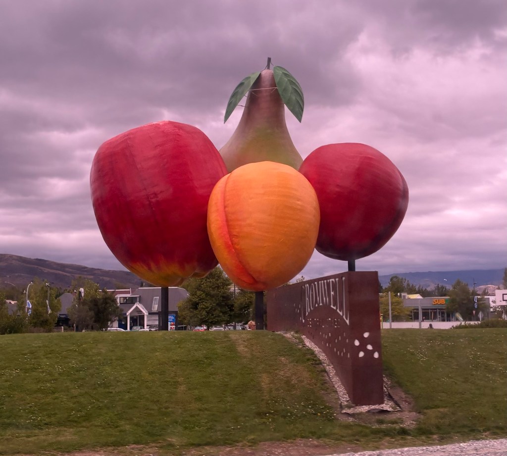 We make a coffee stop in Cromwell, renowned for its sunny climate, fruit orchards and premium Pinot Noir wines…..now you have my attention! Known for its hot dry summers and crisp winters it makes it ideal for stone fruit like cherries, apricots and wine. It is famous for the large fruit sculpture at the town entrance.